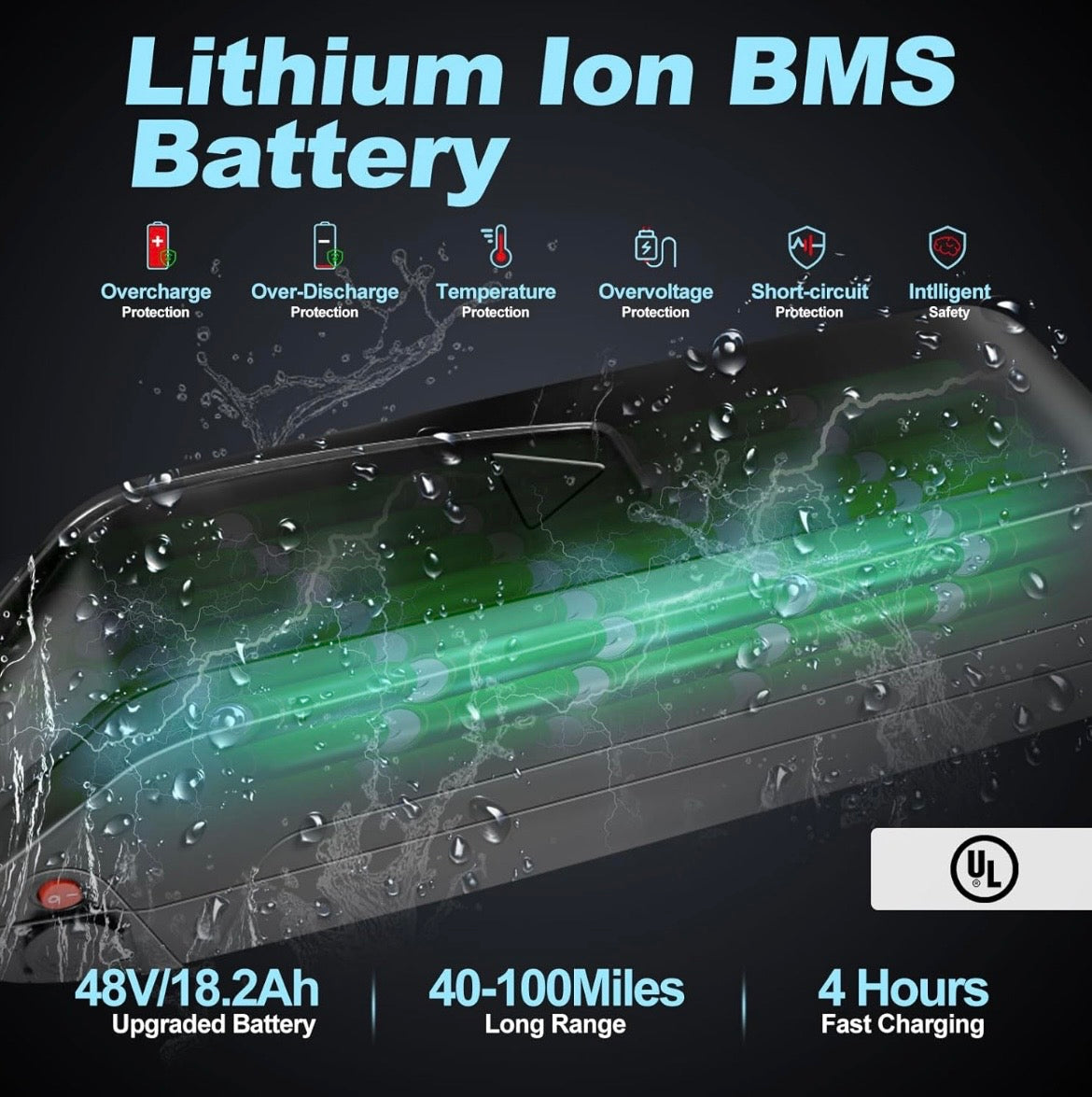 Der 48V/20Ah Lithium-Ionen-Akku sorgt für eine beeindruckende Reichweite von bis zu X km (abhängig von Gelände und Fahrweise) und lässt sich bequem in nur wenigen Stunden wieder aufladen.